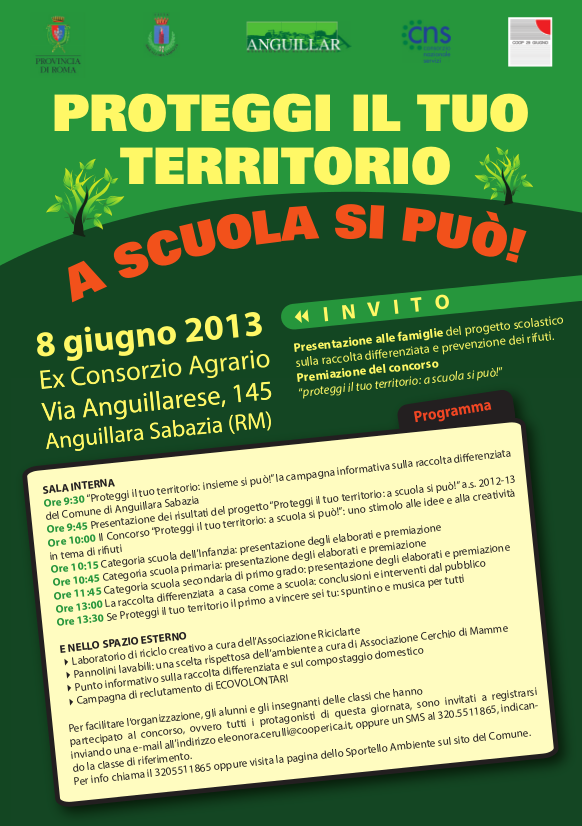 Anguillara Sabazia, 27 maggio 2013 – Un progetto che ha coinvolto tanti ragazzi di molte scuole. E che adesso si presenta alle famiglie e premia l’impegno delle classi. Sono questi gli obiettivi dell’evento “Proteggi il tuo territorio: a scuola si può” che si terrà sabato 8 giugno a partire dalle 9,30 presso i locali dell’ex Consorzio Agrario di Via Anguillarese 145.