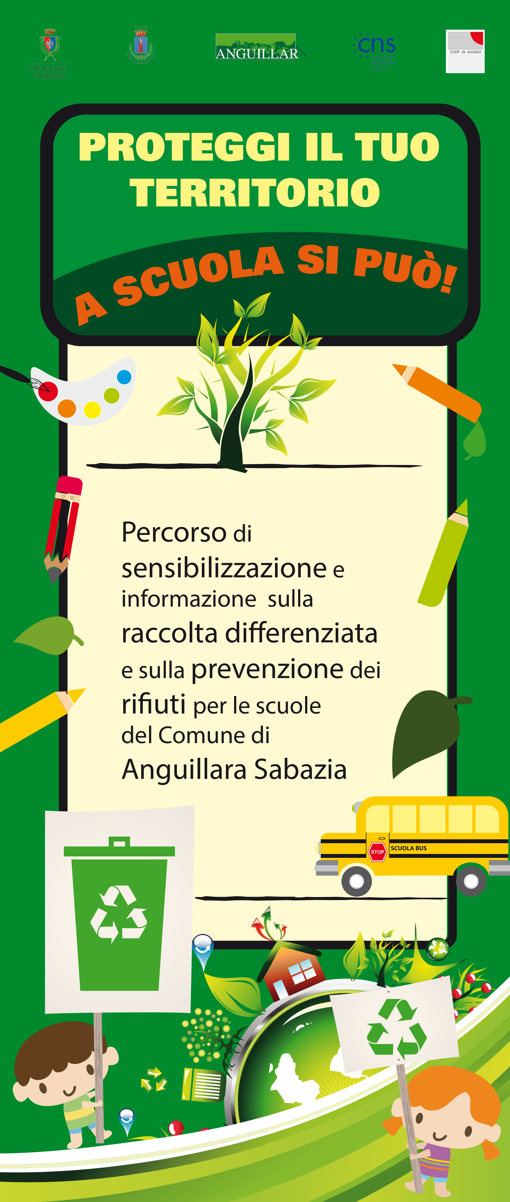L’evento, promosso dal Comune di Anguillara in collaborazione con CNS-Coop. 29 Giugno si aprirà con una presentazione del progetto che a partire da marzo ha coinvolto i ragazzi della scuola primaria, secondaria e dell’infanzia. A seguire si terrà la premiazione dei migliori elaborati preparati dalle classi in concorso nelle diverse categorie. Difatti nelle scorse settimane i bimbi della scuola dell’infanzia hanno realizzato dei disegni collettivi; gli alunni della scuola primaria si sono dedicati a manufatti creativi, mentre i ragazzi della scuola secondaria si sono cimentati nella realizzazione di immagini fotografiche o piccoli video. Per ogni categoria al primo classificato andranno dei buoni da 500 euro, mentre secondo e terzo si aggiudicheranno rispettivamente 300 e 200 euro. A seguire, dopo un dibattito sulla necessità della raccolta differenziata a casa come a scuola, si terrà uno spuntino con accompagnamento musicale.