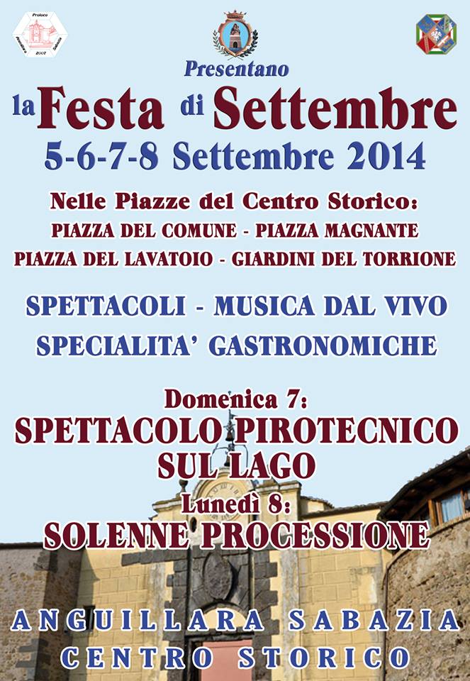 La Festa di Settembre è una tradizione per Anguillara che si rifà all’antica festa contadina che si svolgeva al termine dei lavori dei campi. Si tratta di una manifestazione molto sentita dagli anguillarini, particolarmente devoti alla Madonna delle Grazie la cui statua verrà portata in solenne processione.