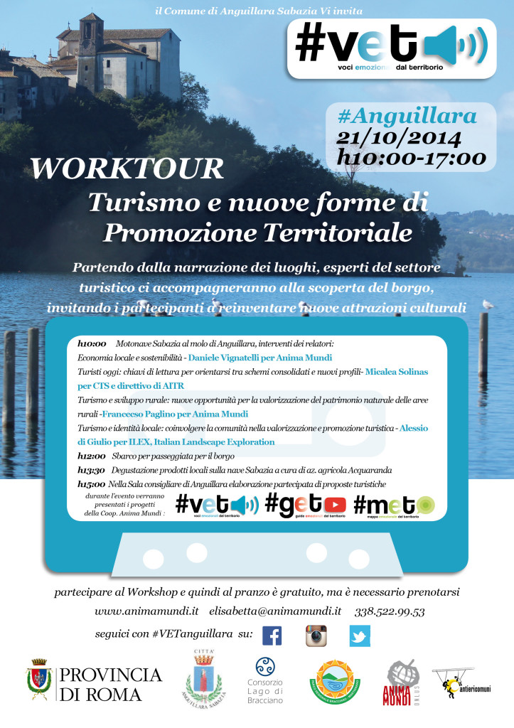 Il Comune di Anguillara Sabazia, grazie ad un finanziamento della Provincia di Roma, in collaborazione con la Coop. Anima Mundi Lazio, propone un Workshop destinato agli operatori del Turismo locale, ma anche a studenti, artigiani, artisti/creativi o semplici abitanti.