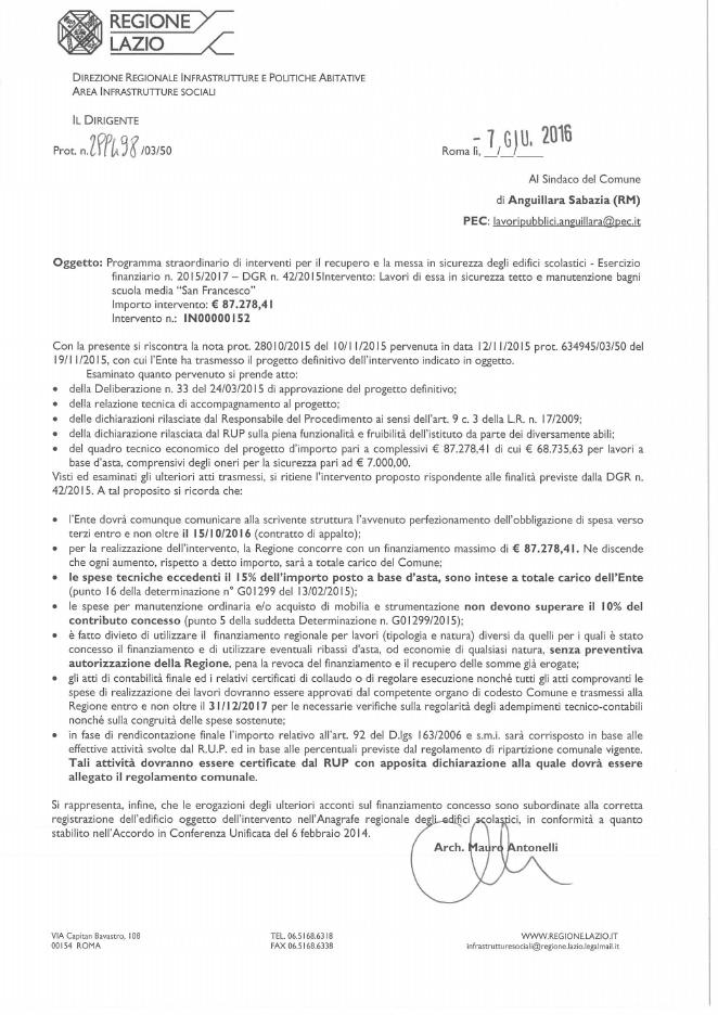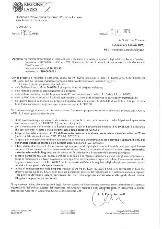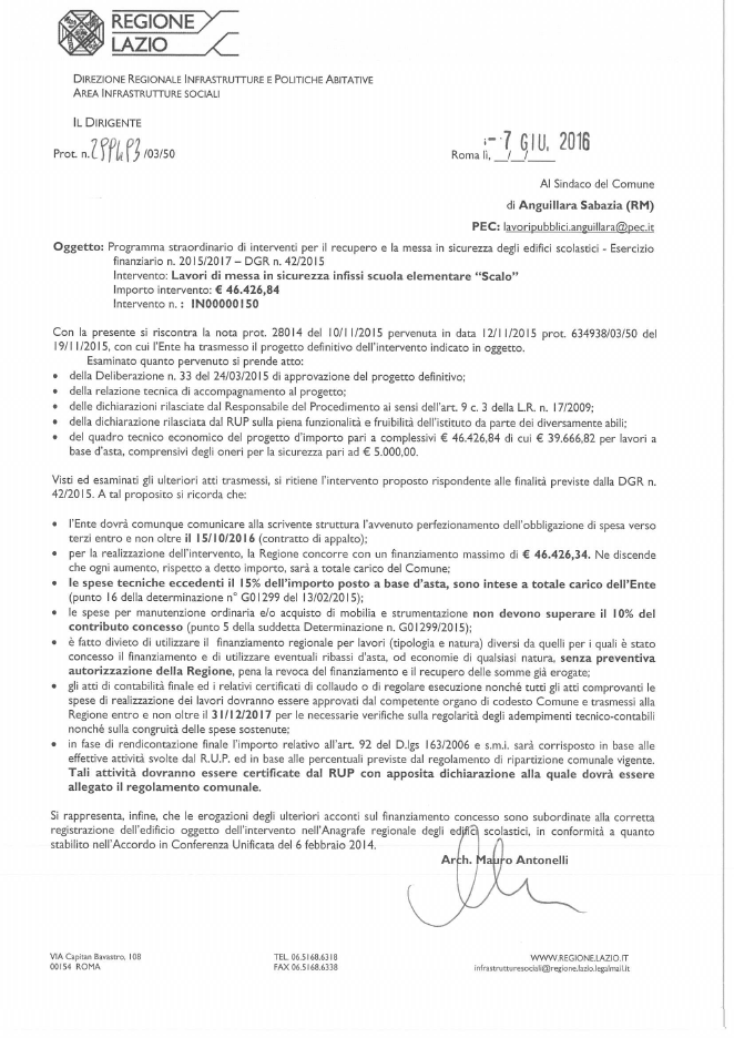 Si da avviso che, come anticipato la scorsa settimana, la Regione Lazio ha concesso i seguenti finanziamenti sulla base delle richieste inoltrare dal Comune sul finire del 2015: