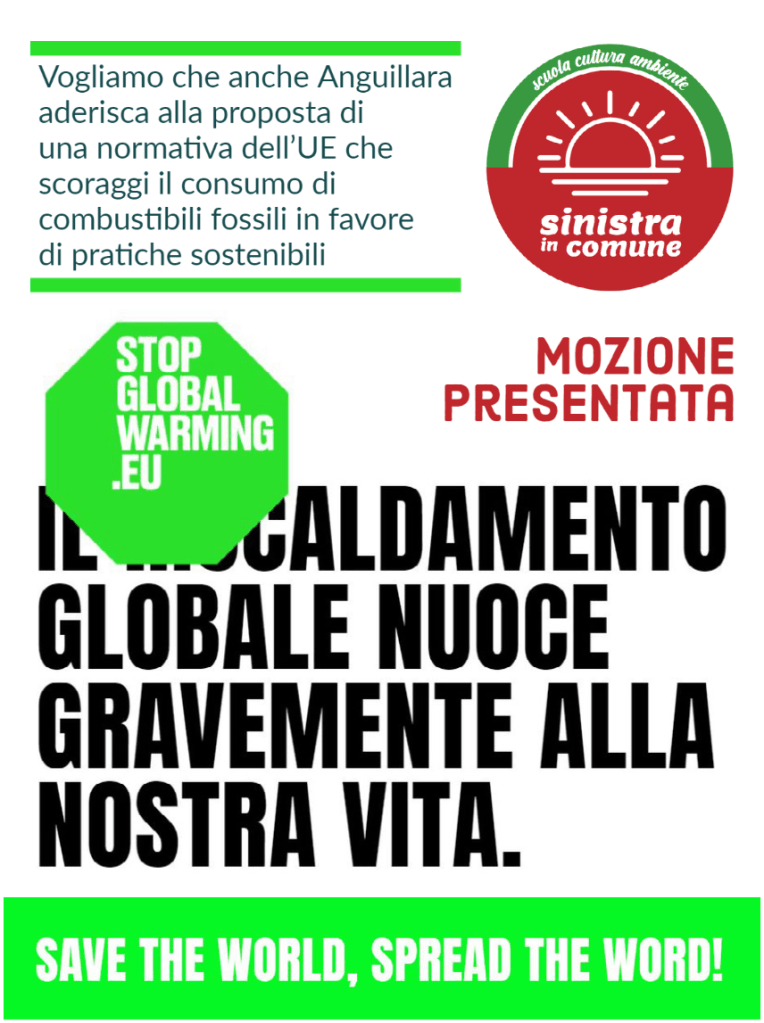 Per questo Sinistra in Comune chiede al Consiglio comunale di Anguillara e a tutti i cittadini di partecipare alla campagna StopGlobalWarming.eu. e di promuovere una campagna informativa in collaborazione con le Scuole e l’Enea e/o con tutte le realtà che possono fornire conoscenza alle nuove generazioni, destinatarie dell’iniziativa qui esposta.