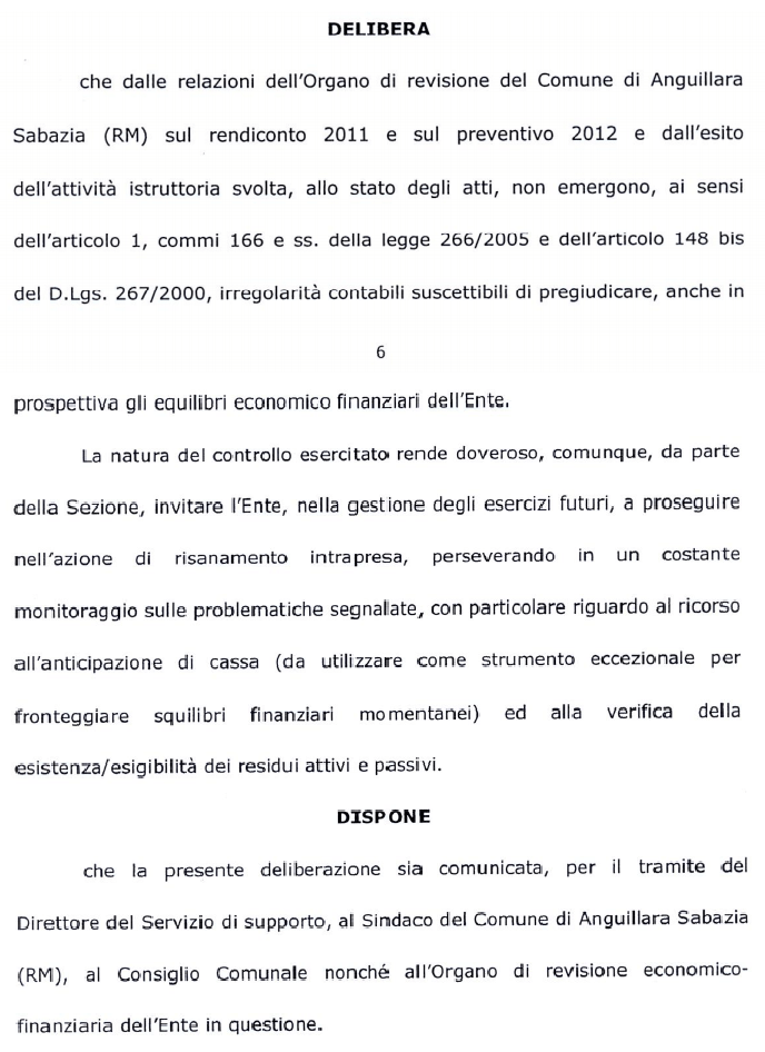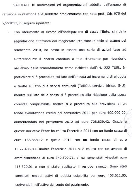 Quello che forse non è noto è che a maggio 2013 la Corte dei Conti inviò al Comune la deliberazione della sezione regionale di controllo (di cui trovate alcuni estratti nelle immagini sopra) nella quale si certificava la buona salute dei conti del Comune (vedi immagine sottostante).