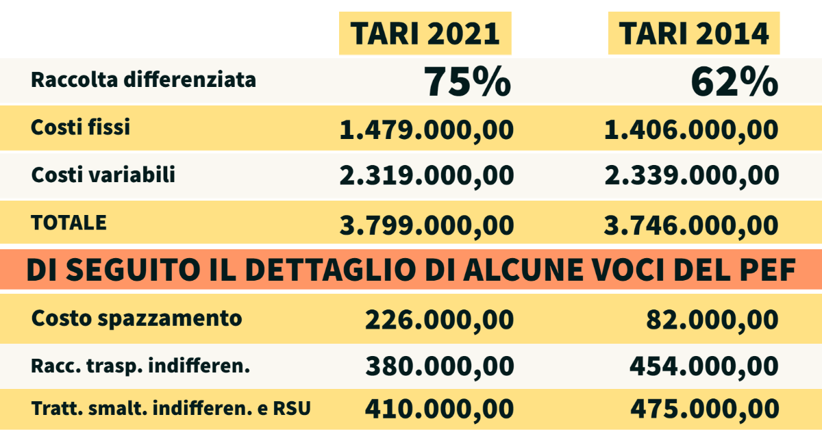 Le tariffe della TaRi del 2021 sono identiche a quelle del 2014! Nonostante la raccolta differenziata sia passata dal 62% del 2014 al 75% del 2020, non v’è traccia di una benché minima riduzione degli importi